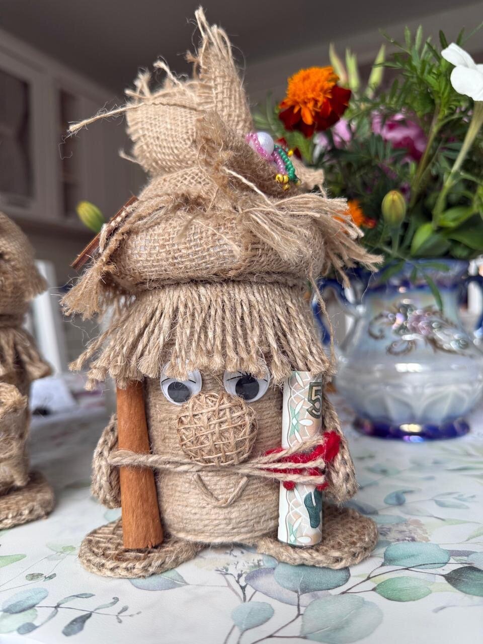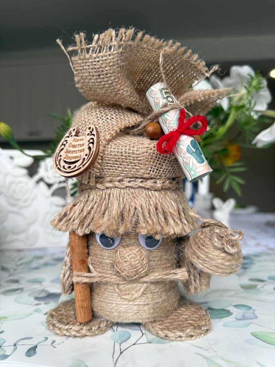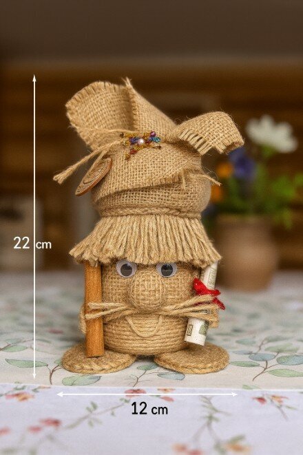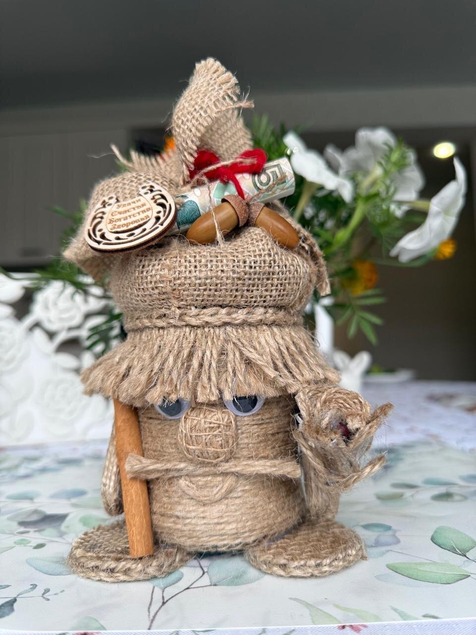 любимому учителю, отличный подарок мужчине, подруге, девушке, парню, папе, брату, бабушке, сестре, для мамы, для девочки. Ваш начальник тоже обрадуется такому подарку, особенно, если у него есть баня. Домовёнок– это оригинальный и запоминающийся подарок, который понравится каждому. Он подойдет как для взрослых, так и для детей, и станет отличным выбором на любой праздник. С древних времен люди считали домового добрым духом, которые защищает дом и ограждает её обитателей от невзгод. Существует поверье, что домовой оберег обретает во всех домах, где живут люди. Оберег домовой способен уберечь от отрицательной энергии и принести счастье в дом. Наши предки были уверенны в том, что в каждом доме обитает хранитель, который оберегает свое жилище и его хозяев. Чтобы заслужить его хорошее отношение славяне уважительно относились к «дедушке» и постоянно его подкармливали. Некоторые даже выделяли для него отдельное место в жилище. Считается, что появление в квартире домового – к добру. Домовой оберегает дом от различных бед, поддерживает семью, следит за чистотой в жилище и создают уютную атмосферу, указывает на поломку бытовых приборов, играет с детьми и домашними животными, привлекает финансы в семью и предупреждает о грядущей опасности. Хорошему хозяину домовой станет верным другом и помощником. Он не допустит пожара или кражи, разбудит утром и напомнит о важных делах. Регулярно беседуйте с домовым, рассказывайте о новостях. Ведь он является полноценным членом семьи, владеющим магией. Наши предки считали, что в любом доме есть домовёнок, оберегающий дом и его обитателей от неприятностей. А вдруг и правда седовласый старичок будет из-за угла наблюдать за Вашим домом и за Вами и приносить счастье и удачу! Особенно приятно преподнести домового на новоселье, а в сундук можно положить деньги или дополнительный сюрприз. Подарок на новоселье должен обладать особой магией, чтобы в семье был всегда уют и порядок! Домовенок ручной работы каждый по своему отличается и второго такого не встретить. Оберег для дома, домовенок Кузя хранитель очага и неотъемлемая часть каждого дома. Домовой — это персонаж славянской мифологии, который считается духом домашнего очага. Он обычно изображается как маленький старичок с бородой, который заботится о доме и его обитателях. Домовой охраняет семью, следит за порядком и благополучием, а также может помогать в хозяйственных делах. Согласно народным поверьям, домовой обитает в укромных уголках дома, таких как чердак, подпол или за печкой. Плетеный домовой покрыт акриловым лаком. Наше изделие долговечное и очень выгодное приобретение. Украсит ваши фотографии во время фотосессий.