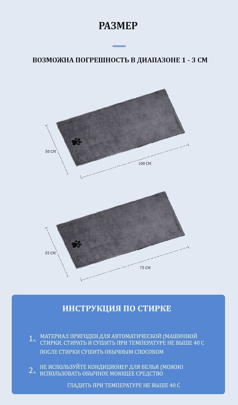 Легкость использования и уход за данным полотенцем – несомненное преимущество. Оно не требует специальных условий для стирки, быстро сохнет и долго сохраняет свои свойства, что обеспечивает долгий срок службы. Оно идеально подходит для использования дома, в путешествиях или на прогулках с питомцем.