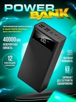 Высокоемкий внешний аккумулятор 40000 mAh - это новинка для всевозможных мобильных устройств, предназначенная для длительного автономного использования в путешествии, в походе, в поездке, на даче и т. д. Этот оригинальный Power Bank, как и другие, подходит для зарядки огромного количества гаджетов, но имеет существенное преимущество - невероятно высокую реальную ёмкость в 40000 миллиампер часов. Наличие цифрового LED дисплея проинформирует Вас об оставшемся заряде в процентах.